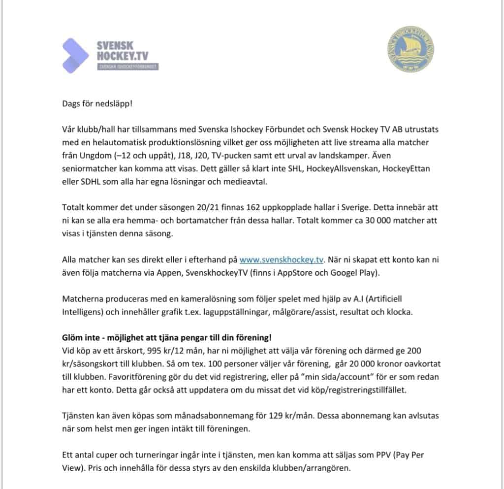 Vår klubb/hall har tillsammans med Svenska Ishockeyförbundet och Svensk Hockey TV AB utrustats med en helautomatisk produktionslösning vilket ger oss möjligheten att livestreama alla matcher från ungdom (-12 och uppåt), J18 och J20.