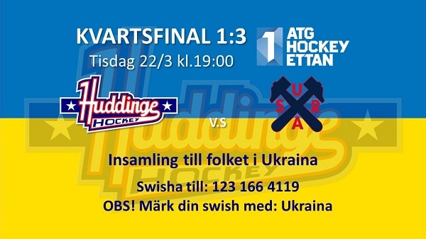 I samband med matchen kommer Huddinge Hockey, tillsammans med Lions i Huddinge, att samla in pengar till förmån för det krigsdrabbade folket i Ukraina. Vi kommer bl.a. att skänka hälften av intäkterna som kommer in i samband med matchen på ex. biljetter, 50/50-lotter.Vill du stötta med valfri summa kan du swisha till: 123 166 4119