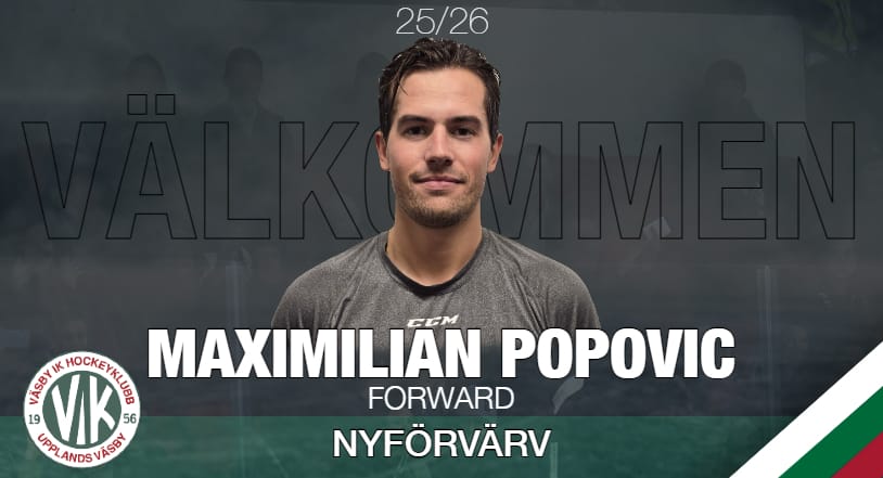 Vi hälsar Maximilian Popovic varmt välkommen till Väsby Hockey! Han kommer därmed för första gången i sin seniorkarriär att spela tillsammans med sin lillebror, Alexander.