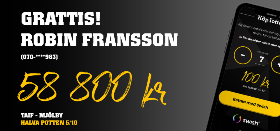 mån 6 okt 10:37 Vinnare Halva Potten 5/10 Vinnaren av Halva Potten 5/10 blev Robin Fransson som vann 58 800 kr.