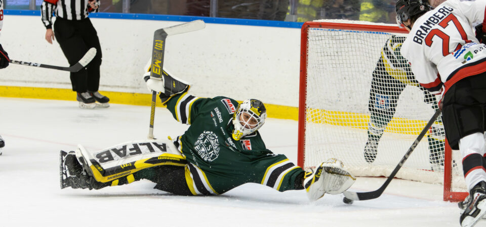 I andra perioden fortsätter ESK att trumma på. Piteås kvittering till 1-1 kändes därför inte helt rättvis sett till matchbilden. ESK:s inlånade målvakt från allsvenska Västerås, Bennedikt Oschgan, blev överspelad och fick släppa in sitt första i Hockeyettan men han var inte så långt ifrån att rädda vilket syns på bilden ovan.