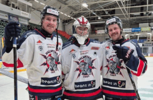 På bilden syns han med målskyttarna mot NSK, William Berg (till vänster) och Melker Iversen.