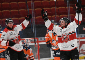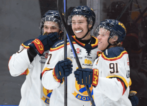 Hudiksvall vann ”Slaget om Gävleborg” mot Strömsbro (4–0) och Hudik har nu nu 13 raka (!) segrar i norra serien. Matchen spelades i Brynäs hemmaborg Monitor ERP Arena och lockade 1653 åskådare. På bilden jublar Rasmus Kahilainen efter 3–0.