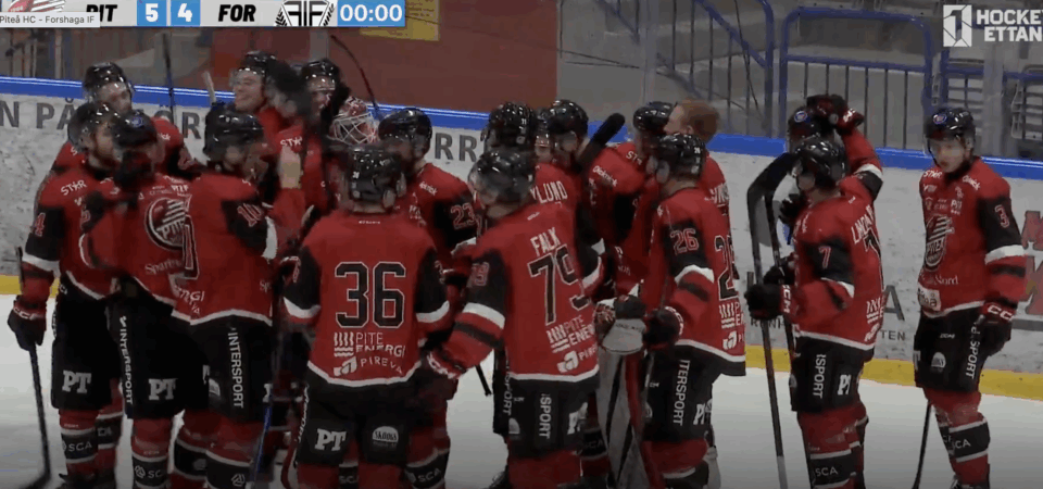 Vi börjar den andra perioden starkt och dominerar spelet och efter 3.38 vinner Alfred Bergman pucken i en forecheck och driver fram pucken runt Piteås målbur och Gustav Ling vinner kampen i slottet kan göra 2-1 till oss. Kedjan med Gustav Ling, Linus Johnsson och Alfred Bergman har Piteå stora problem med att hantera. Rasmus Åkerblad åker på två minuter på botbänken lite senare men det hanterar vi enkelt. 2.-2 är en tråkig historia. Pelle Hedlund bör få en två minuters utvsining med sig på Piteås försvarsblå. Istället kan Piteå och Melvin Pettersson kontra in 2-2. Bra gjort av Melvin, men Lönn … Efter 2-2 fortsätter vi dominera spelet och Piteås Albin Nylund åker ut två minuter för hakning. I power playet som följer gör vi det faktiskt riktigt bra, Pucken går snabbt och och det finns attack i spelet. Mycket på grund av Hugo Hell. Och det är just Hugo som på ett direktskott skjuter in 3-2 för oss. Assisterad av Karl Andersson och Anton Wiklund. Vi fortsätter att spela bra och med bara drygt tre minuter kvar hittar Johannes Frisk Gustav Ling med en briljant passning och Gustav gör inga misstag utan kan skjuta in pucken till 4-2 bakom Albin Edlund i Piteås mål. Vi dominerar perioden och vinner den klart. Skotten i andra 8-4 i vår favör.