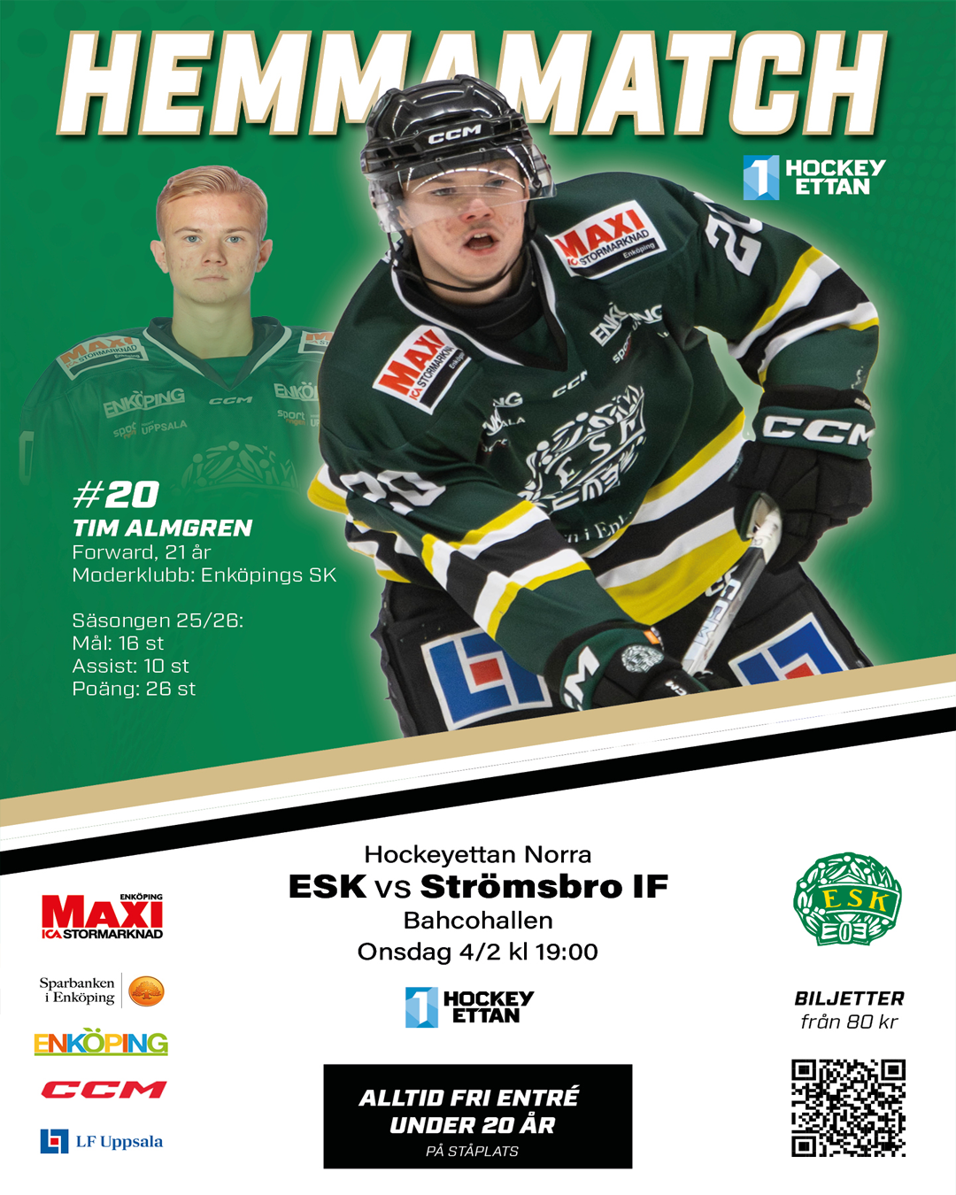 1,61 poäng snittar förövrigt onsdagens motståndare hemma i Bahcohallen, Strömsbro IF, men då på hela säsongen. Med det har man intagit sjundeplatsen och skaffat sig en god marginal nedåt vad gäller slutspelet. Det är plats 7-10 som tar de så kallade playin-platserna i slutspelet.I senaste mötet hemma hos Strömsbro uppe i Gävle tog gästrikarna en enkel seger med 5-2 då ESK den kvällen utgjorde en ganska slät figur.