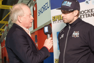 Lasse Kinch intervjuar Per Ledin. FOTO: HOCKEYETTAN PLAY